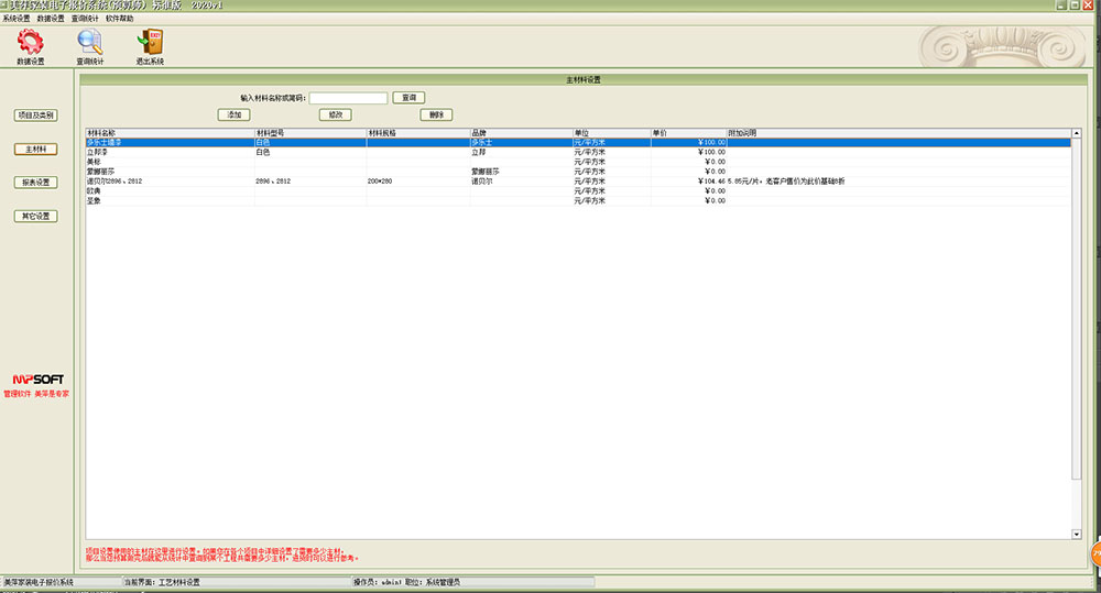 2、 主材料:主材料信息中保存的是工程中所用到的主材料名称,型号,单价,数量等。