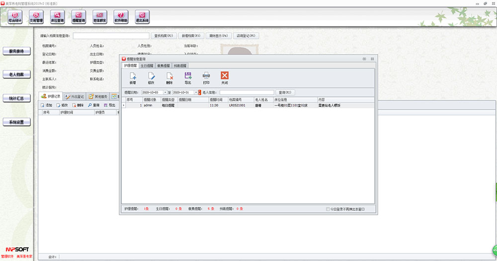 4、支持护理提醒、生日提醒、事件提醒、欠费提醒、出入登记、自定义服务记录、事件记录管理。