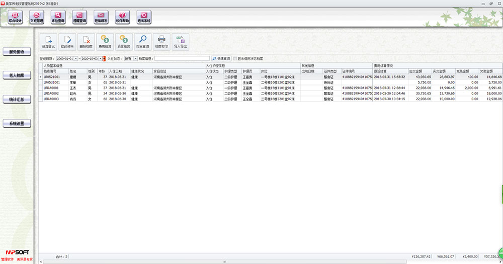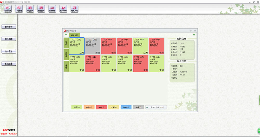 3、统计报表丰富,可对老人的续费、欠费、缴费、请假、护理情况,床位实时使用情况,咨询接待、员工工作情况进分析汇总。