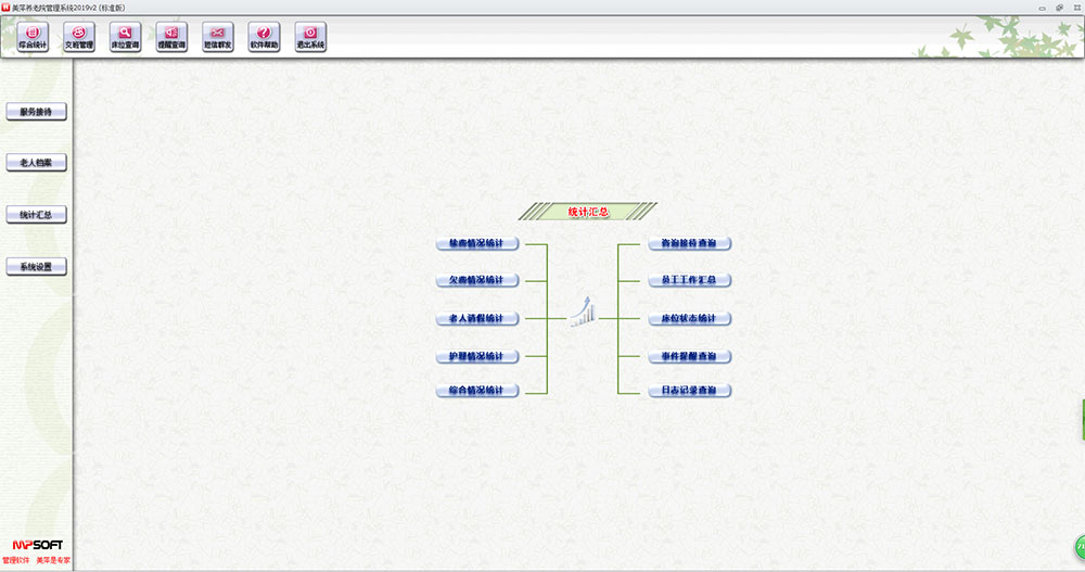 美萍养老院管理系统是一款根据养老机构业务特点设计的专用管理软件,界面设计简洁、美观、易用。软件涵盖咨询接待、档案管理、员工、房间床位、护理、外出登记、事件记录提醒、费用管理、护理管理、短信及微信消息提醒、统计汇总、系统设置等模块。涉及从咨询、接待、入住到退住的所有流程。系统设计以具体的业务对象为目标,以老人为中心,以业务为主线,充分重视客户的管理特色和风格。通过明确岗位职能,科学规范管理,有效提高人员工作效率,提升服务质量和竞争力。