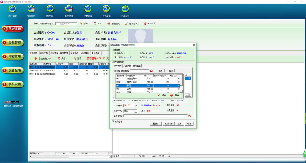 5、支持多种结帐方式:现金、储值卡、代金券、信用卡。