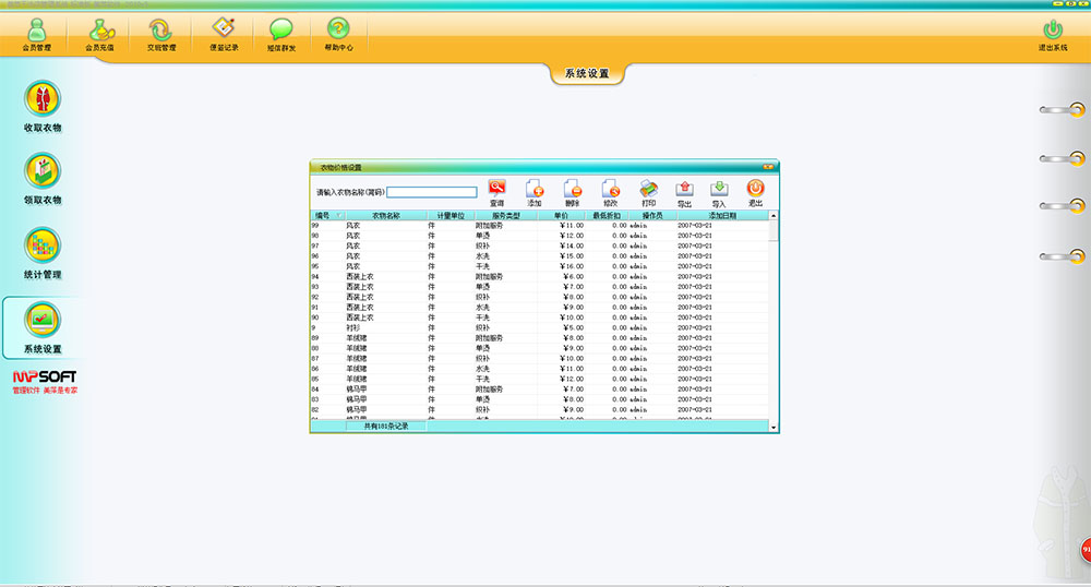 美萍干洗店管理系统是一款专业的洗衣店管理软件,它集前台收费收银系统,会员卡管理系统,财务报表系统等强大功能为一身,系统界面简洁优美,操作直观简单。美萍洗衣店管理系统为广大干洗店,洗衣店提供了成本分析,利润分析,洗衣流程管理等诸多功能,用全新的经营理念,将干洗店经营者和消费者、经营管理和服务有效地融合在一起,建立起规范的经营模式,提高您在行业中的管理档次和服务水平,使您在激烈的竞争中轻松胜出。