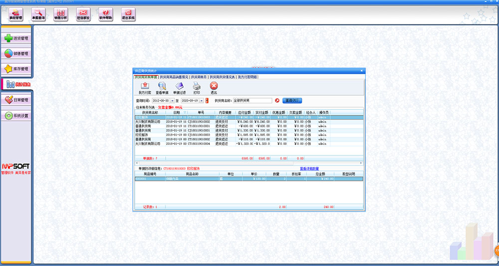 4、统计报表:完整的统计查询功能,每张单据每次收款付款都可以清楚的反映。